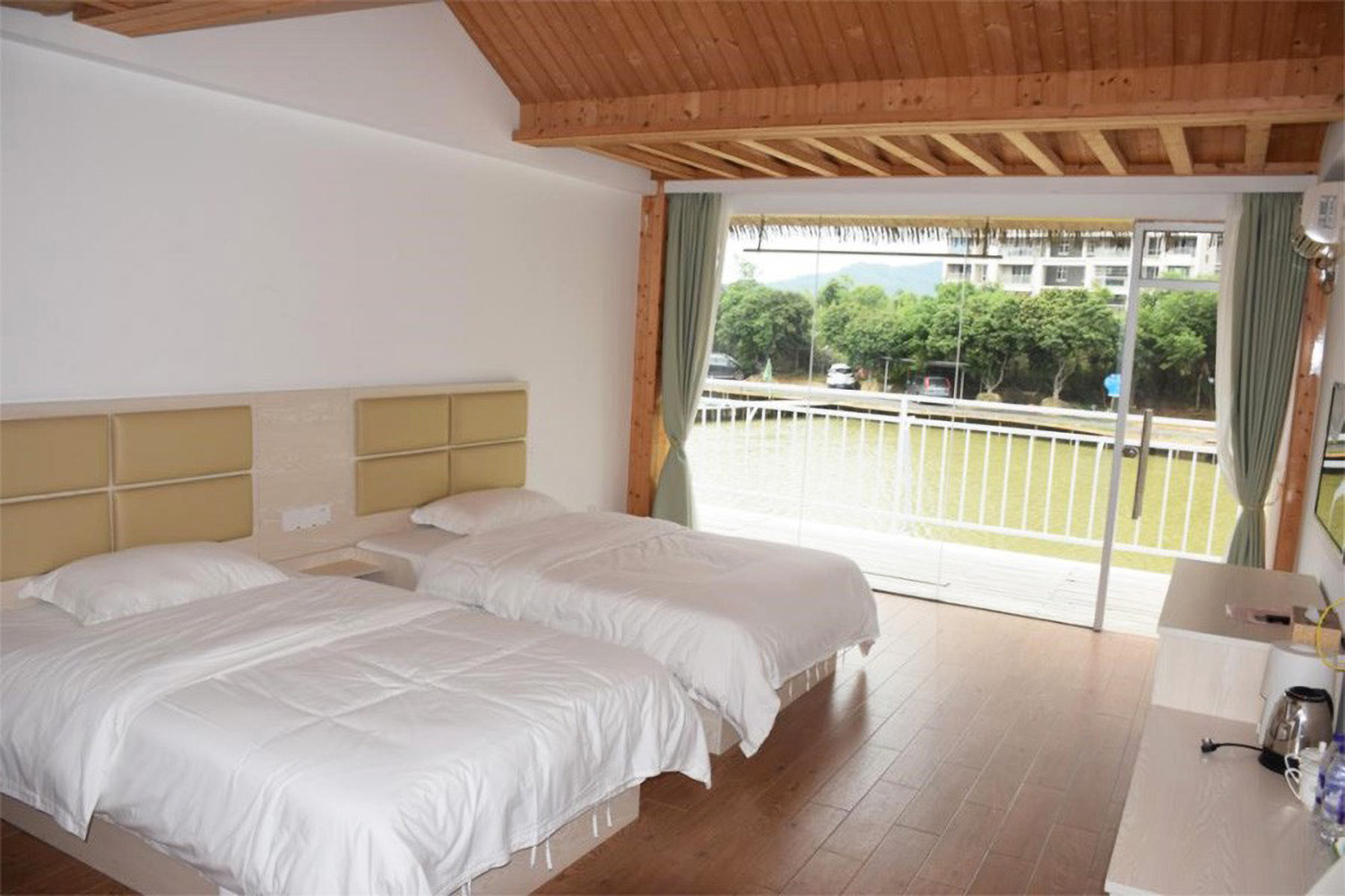 有专家招待所,共12个标双和2个套房,纯原木装修,铺草按四星级配置,每间房都是临湖,还有一个大大的露台。